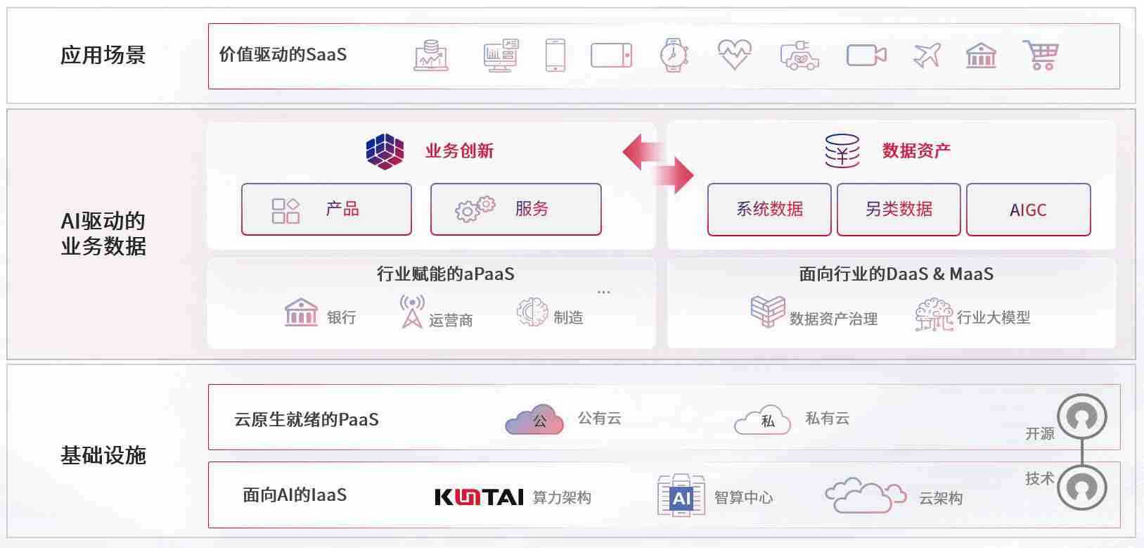 数字时代,,,,围绕企业数字化转型的关键要素,,,PA旗舰厅数码开创性的提出数云融合战略和技术体系框架,,,着力在云原生、、、、数字原生、、、、AI原生和信创产业上架构产品和服务能力,,,,为处在不同数字化转型阶段的快消零售、、、汽车、、、金融、、、医疗、、、、政企、、教育、、、运营商等行业客户提供泛在的敏捷IT能力和融合的数据驱动能力,,构建跨界融合创新的数字业务场景和新业务模式,,,助力企业级客户建立面向未来的核心能力和竞争优势,,,全面推动社会的数字化、、智能化转型升级。。。。